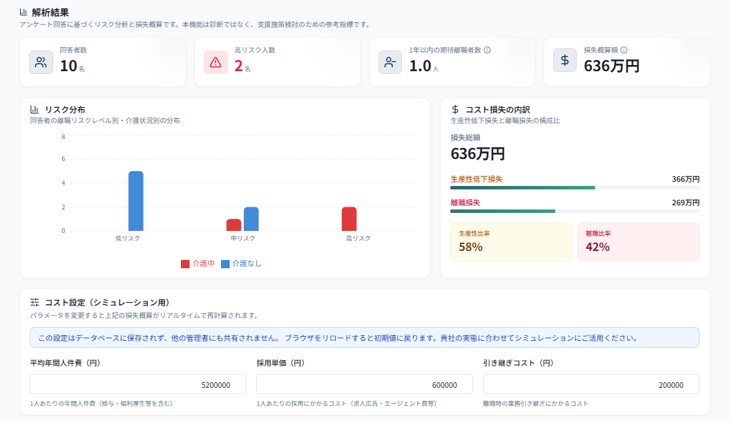 離職リスク確率・期待離職者数・介護離職コストを自動試算。
