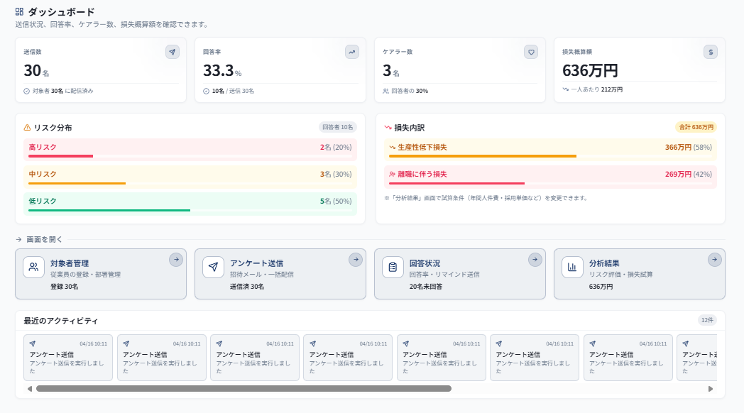 匿名アンケート配信・自動集計・リスク確率化・コスト試算までをワンストップで。 小規模から導入でき、結果は管理画面でリアルタイムに可視化されます。