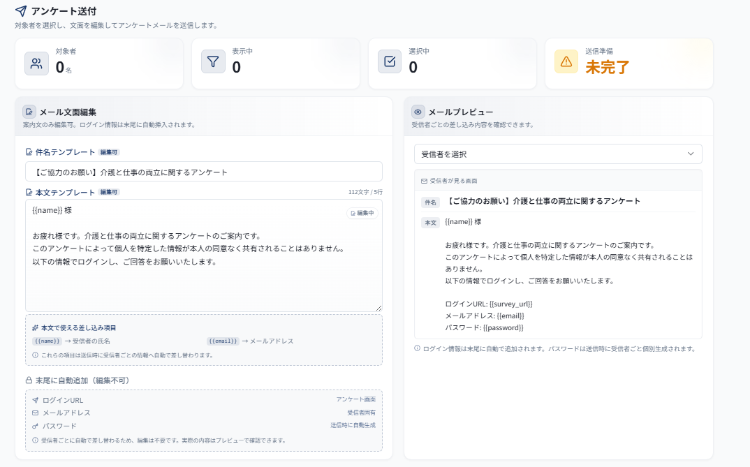 企業管理者が従業員リストを登録し、アンケート招待メールを送信します。
